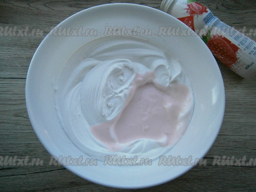 К взбитым сливкам добавить клубничный питьевой йогурт, взбить сливочную смесь.
