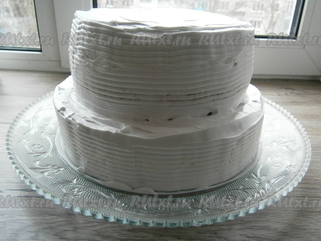 Затем торт нужно выровнять любым кремом, я для этого использовала тот же кондитерский крем, который я взбила - он отлично держит форму. Вместо него можете использовать или взбитые сливки, или крем "мокрое" безе. Таким же образом нужно выровнять и второй (меньший) бисквит отдельно, затем его нужно аккуратно разместить на нижнем бисквите.