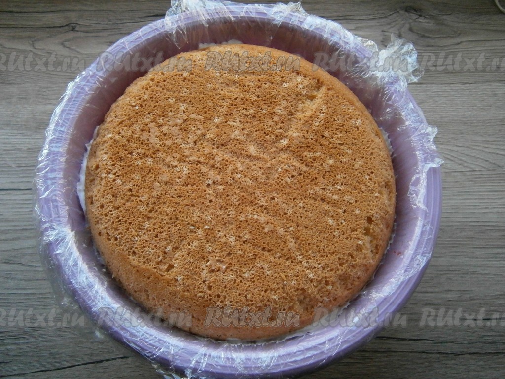 Выпекать бисквит в разогретой до 180 градусов духовке минут 35-40. Также, использовав оставшиеся продукты, испечь и второй бисквит в меньшей форме. Бисквиты полностью остудить и дать им отлежаться 7-8 часов. Для этого их нужно завернуть в пищевую пленку и поместить в прохладное место.