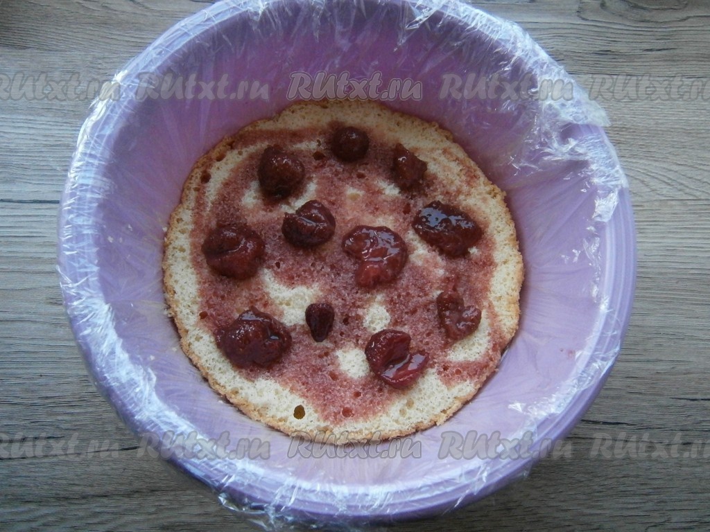 Нижнюю часть второго бисквита также поместить или в форму, или в глубокую миску (посуда должна быть диаметром чуть больше бисквита), застеленную пленкой, и тоже пропитать клубничным джемом, смешанным с коньяком.