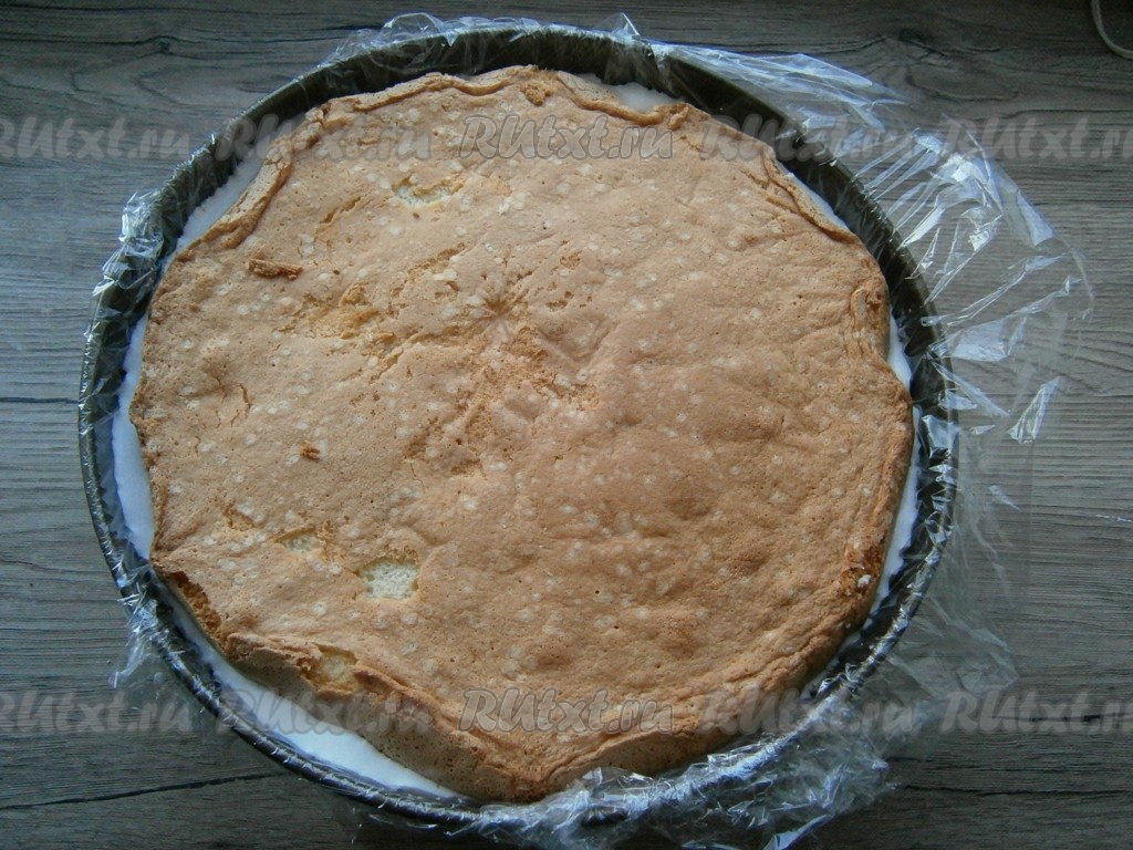 Тщательно перемешать получившуюся смесь до однородности и этой смесью залить нижнюю часть большего (уже с пропиткой) бисквита.