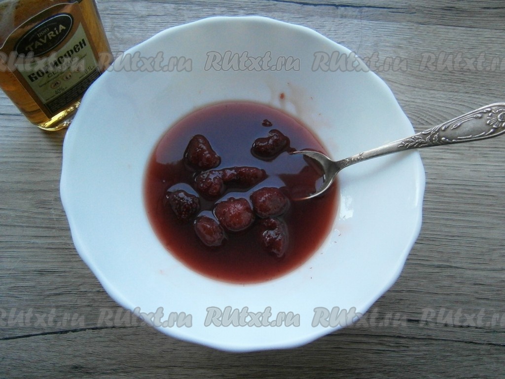 Затем бисквиты нужно разрезать пополам. Нижнюю часть каждого бисквита нужно будет пропитать клубничным джемом, смешанным с коньяком.