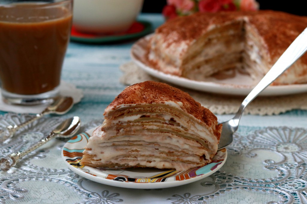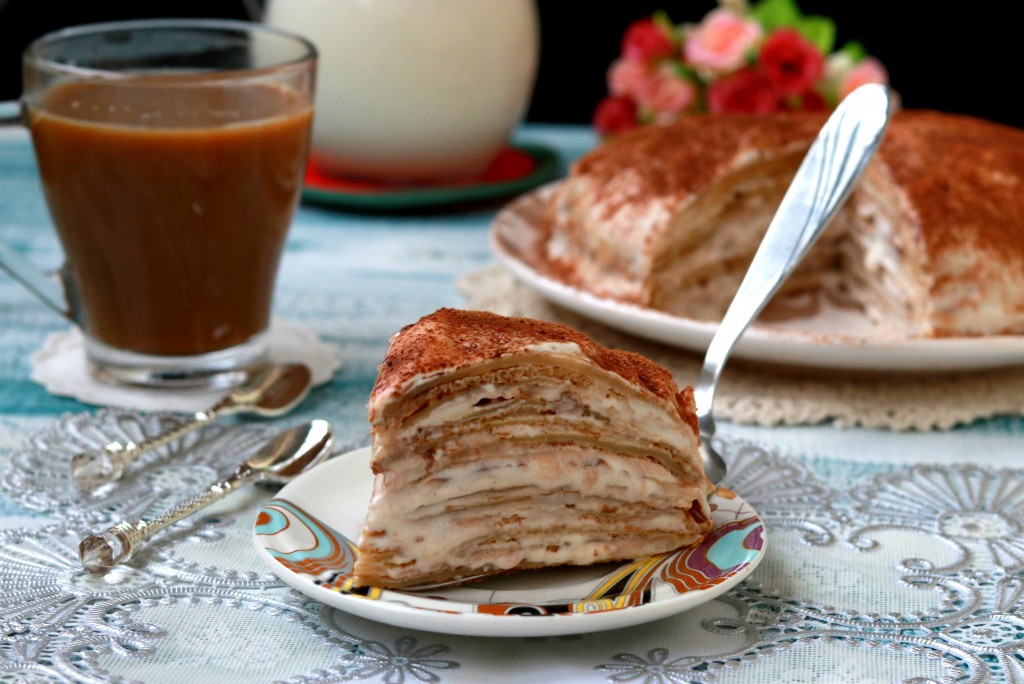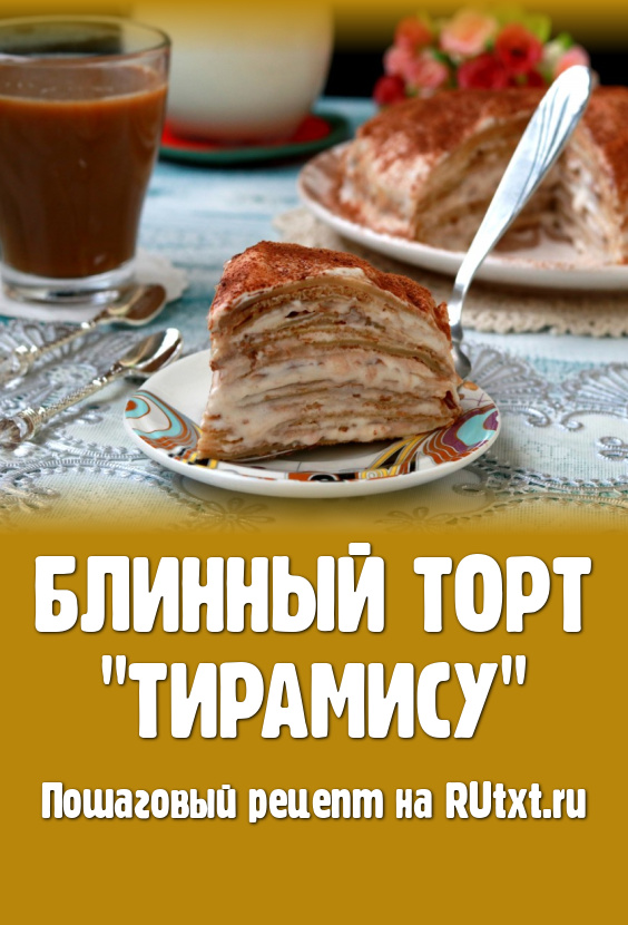 Рада предложить вам приготовить очень вкусный блинный торт "Тирамису". Он по вкусу отличается от классического десерта "Тирамису", да и готовится из других, более доступных продуктов. Для такого торта подойдут любые тонкие блинчики. Я приготовила блинчики из сухого молока, а вы можете испечь по своему любимому рецепту. После приготовления торт должен пропитаться пару часов в холодильнике, а затем его можно нарезать и подавать. Такой торт станет отличным дополнением к кофе, чаю или какао.