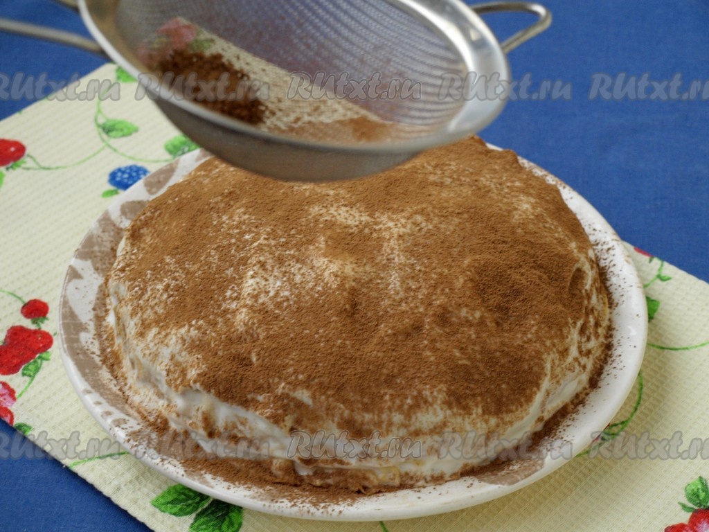Затем посыпать торт какао и убрать в холодильник на пару часов.