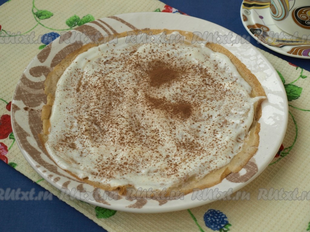 Смазать блинчик сметанным кремом и посыпать через ситечко немного какао.