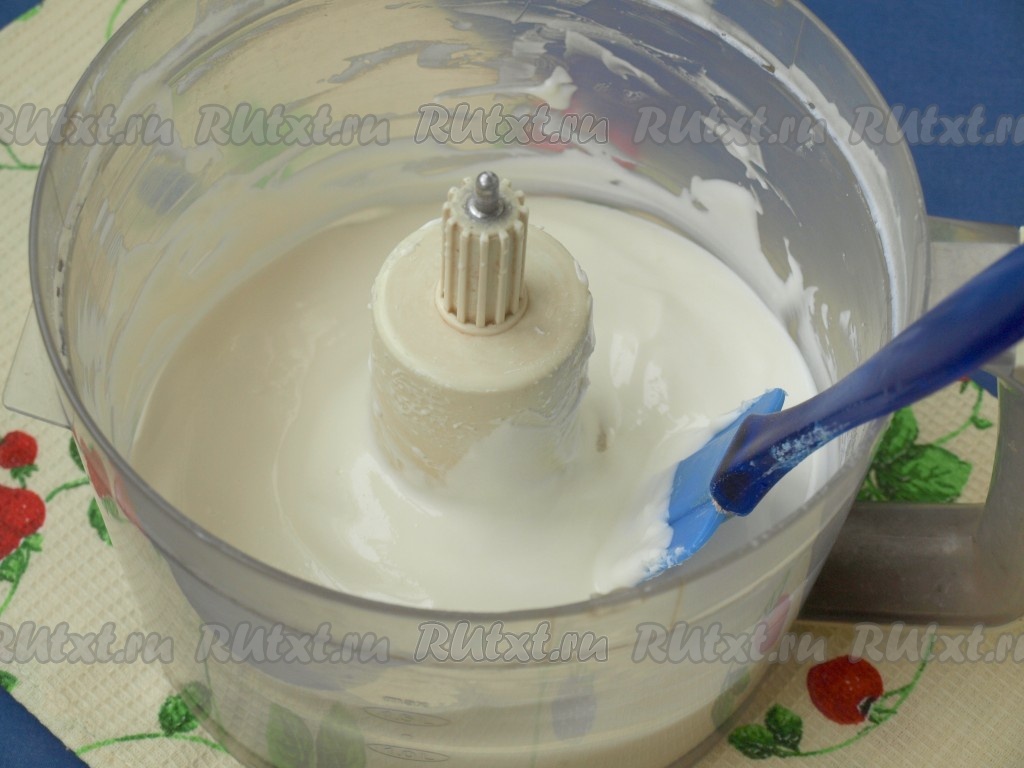 Перед тем как приготовить торт, у вас уже должны быть готовые остывшие блинчики, а также нужно приготовить сметанный крем. Несколько слов о сметане. Если вам удастся купить хорошую домашнюю сметану, то взбить её с сахарной пудрой не составит никакого труда: поместите сметану в чашу комбайна и взбивайте, подсыпая частями сахарную пудру. Сметана сначала станет жидкой, а затем начнёт загустевать буквально на глазах. Если будете готовить крем из магазинной сметаны, то без загустителя крем не получится или же сметану придётся отвешивать в марле, а на это нужно время. Я готовила крем из сметаны жирностью 20% и добавляла в неё загуститель для сливок и сметаны, который сейчас можно купить в любом крупном супермаркете. Сметана сначала взбивается с сахарной пудрой, а затем в неё добавляется загуститель и хорошо перемешивается. И ещё одна важная деталь: и сметана, и чаша, в которой будет взбиваться крем, должны быть холодными.