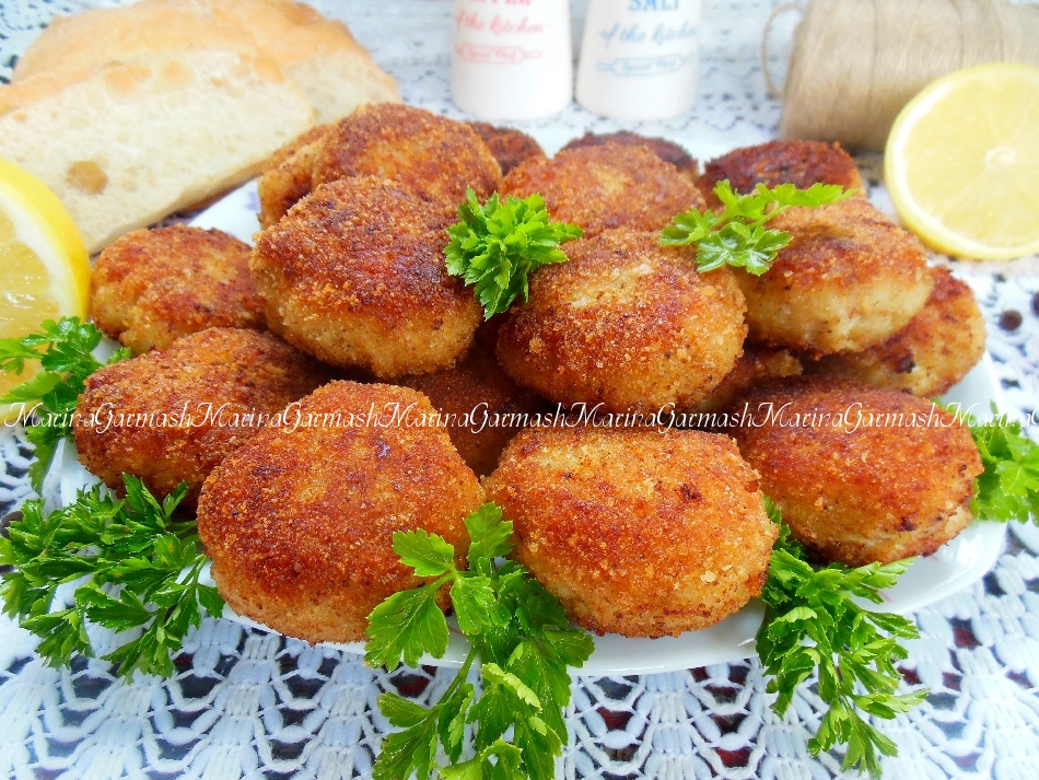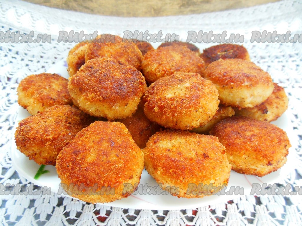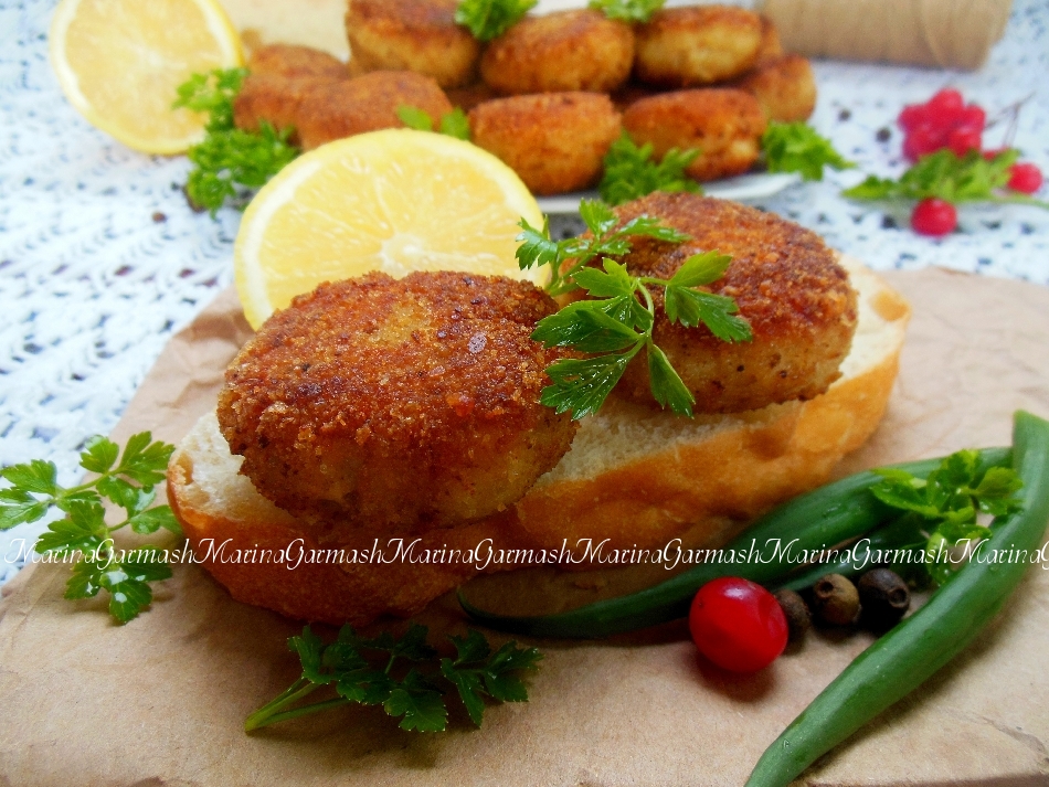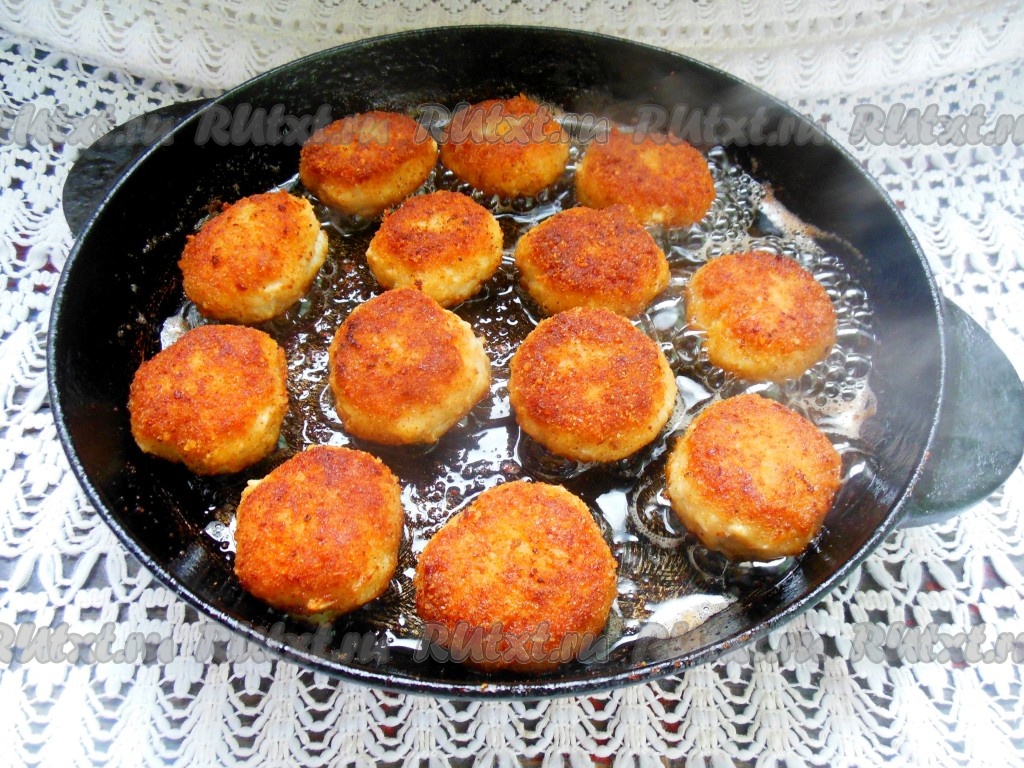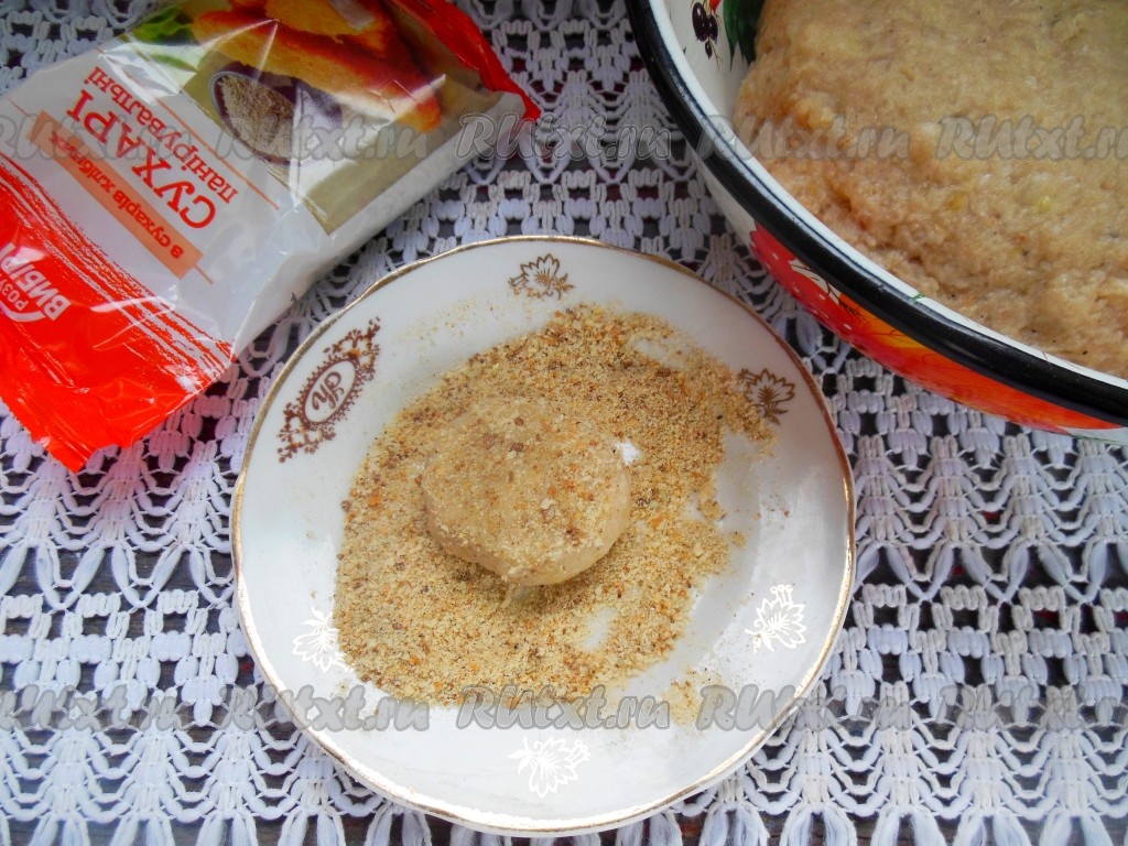 Сформируйте небольшие котлетки, обваляйте их хорошо в панировочных сухарях. Благодаря панировке и добавлению сала, рыбные котлеты из щуки не потеряют свой сок в процессе жарки и получатся сочными.