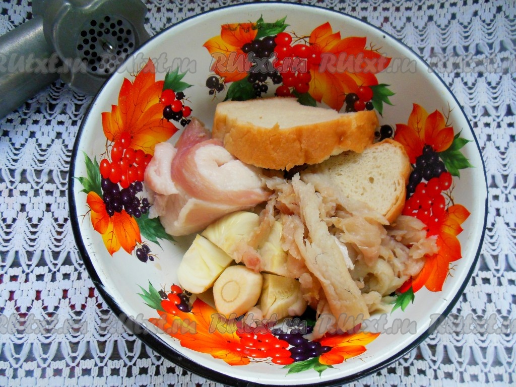 Батон замочите в воде или молоке, отожмите. С сала снимите шкуру, очистите лук и чеснок. С помощью мясорубки измельчите замоченный батон, сало, лук, чеснок и рыбу. Лучше пропустить через мясорубку 2-3 раза, чтобы измельчить все косточки, которые могли остаться.