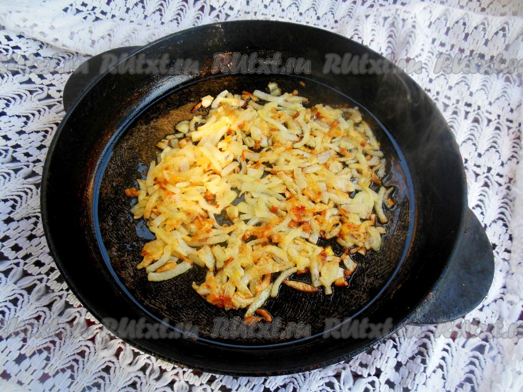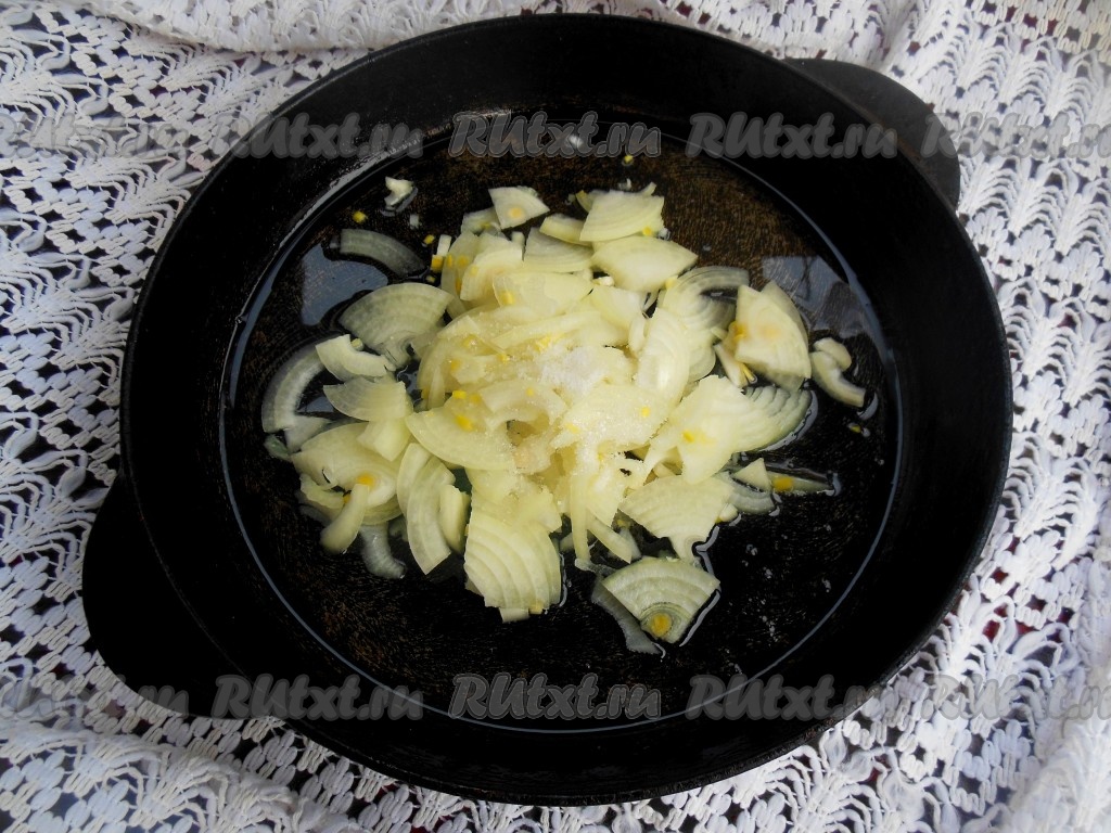 Репчатый лук очистить, нарежьте на четвертинки, а затем каждую четвертинку разрежьте на тонкие ломтики. На сковороде, хорошо разогретой с растительным маслом, обжарьте лук с щепоткой соли и сахара.