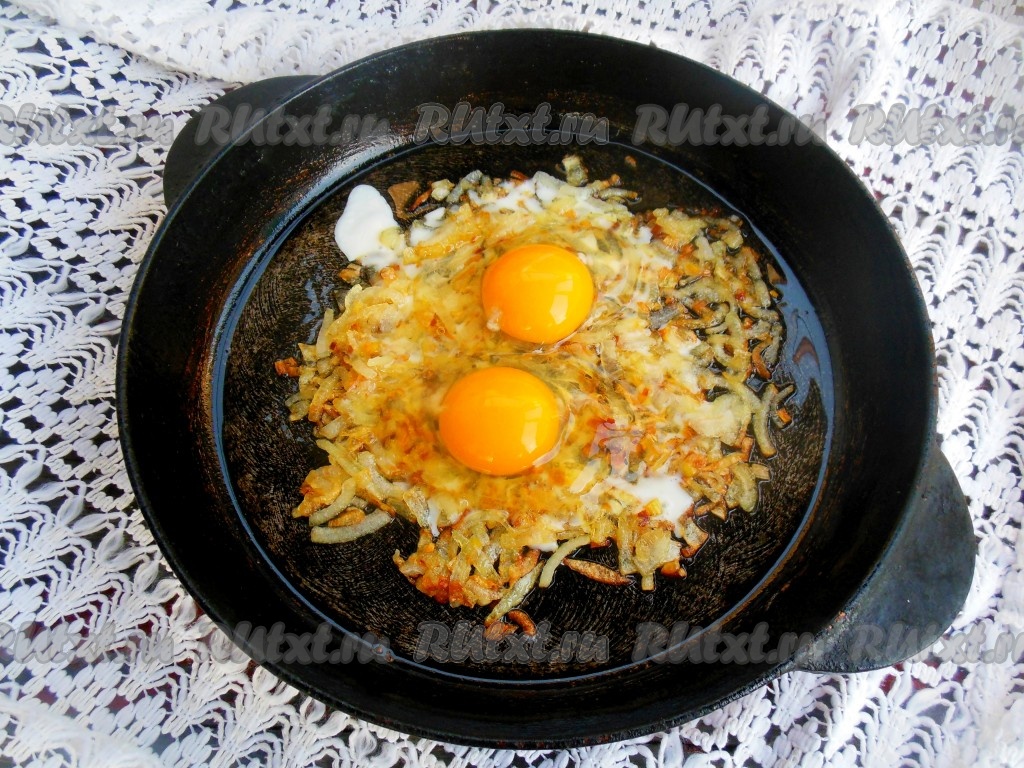 Разбейте яйца на сковороду так, чтобы желтки оказались в центре луковой массы. Желательно, чтобы желтки остались целыми.