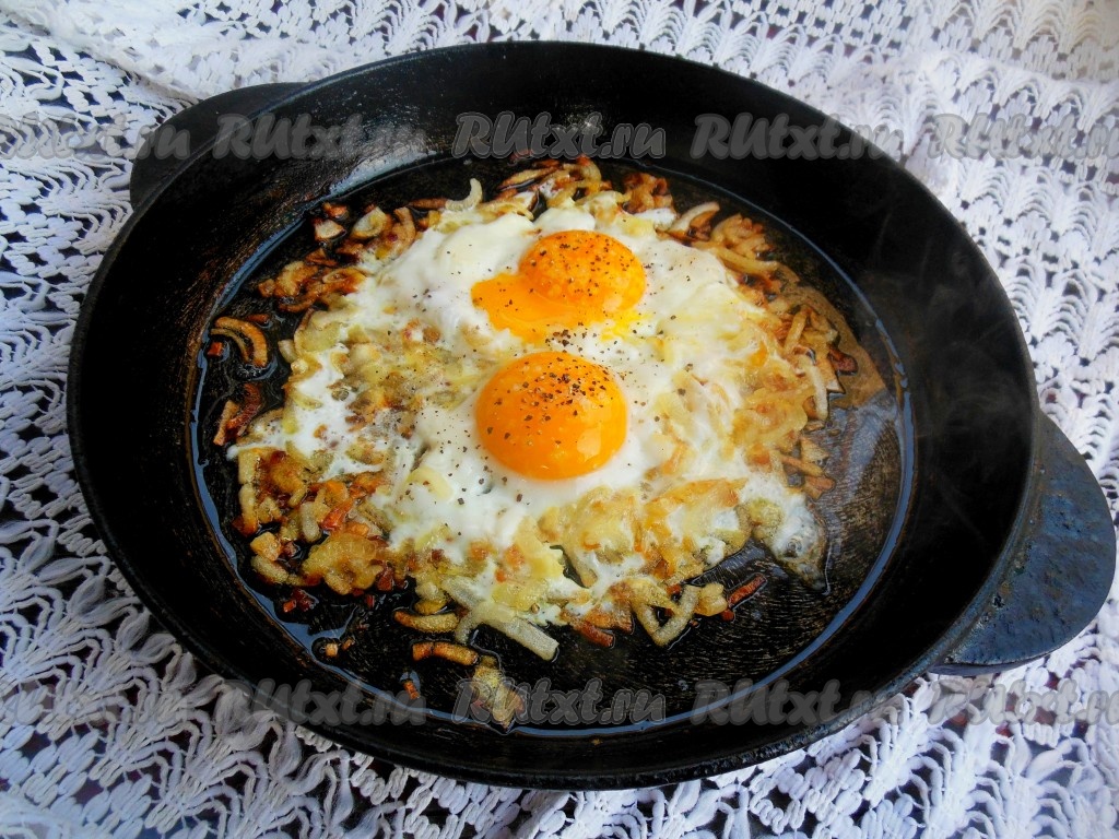 Готовьте яичницу около 3-4 минут на медленном огне (белок должен полностью "схватиться"). В конце приготовления добавьте соль и черный молотый перец.