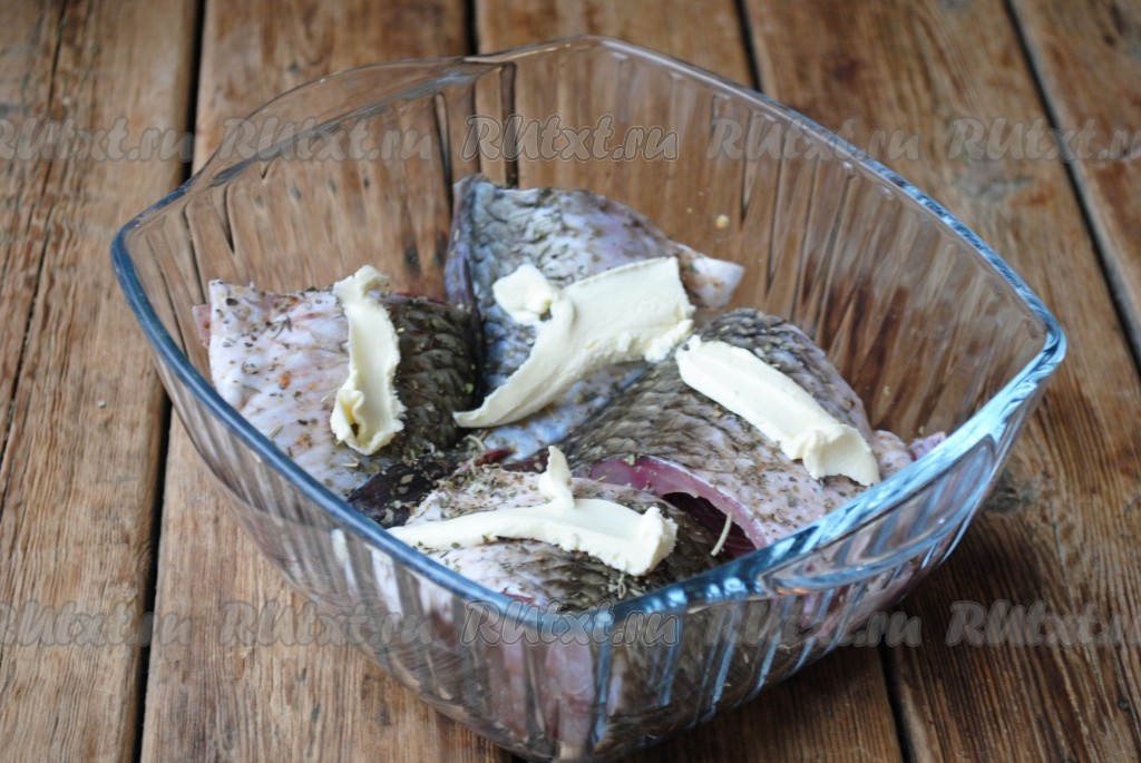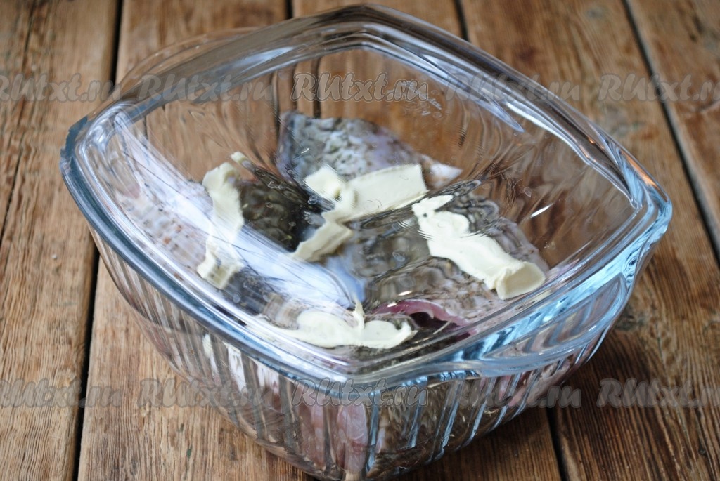 Выложить рыбу в форму, которая подходит для микроволновой печи. На каждый кусочек рыбы выложить сливочное масло (как на фото).