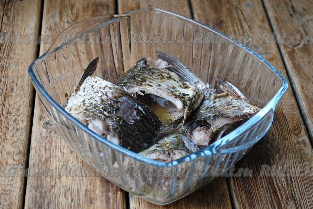 Карасей очистить от чешуи, удалить внутренности, хорошо вымыть и отрезать голову (она нам в этом рецепте не понадобится). Если рыба крупная - разрезать её пополам. Карасей посолить, добавить специи и полить лимонным соком. Аккуратно перемешать, чтобы все кусочки хорошо обвалялись в специях.