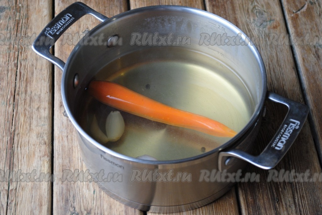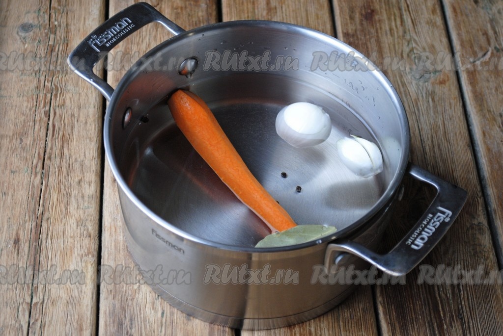 Лук и морковь очистить. В кастрюлю налить холодную воду и выложить овощи. Если луковица крупная, её нужно разрезать пополам и отправить в кастрюлю только половину. Также добавить к овощам чёрный перец горошком и лавровый лист.