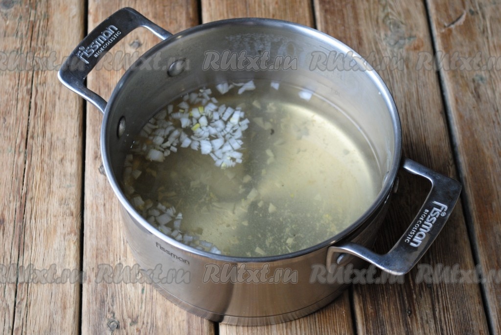 Вторую половину луковицы нарезать мелкими кубиками, добавить в овощной бульон, проварить 5 минут на небольшом огне.