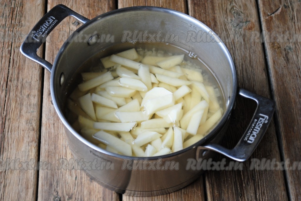 Картофель очистить, вымыть, нарезать соломкой, добавить в бульон и варить 10-15 минут (до мягкости). Время варки будет зависеть от сорта картошки.