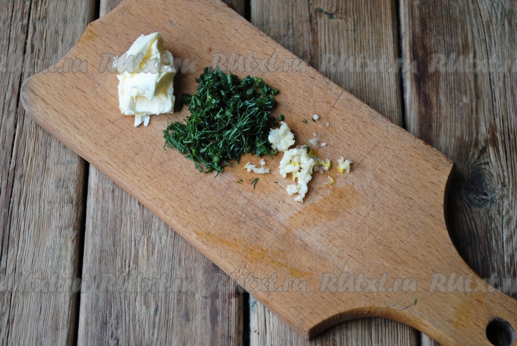 Затем суп посолить, добавить мелко нарезанный укроп, пропущённый через пресс чеснок и сливочное масло, проварить 1 минуту и снять суп с огня.