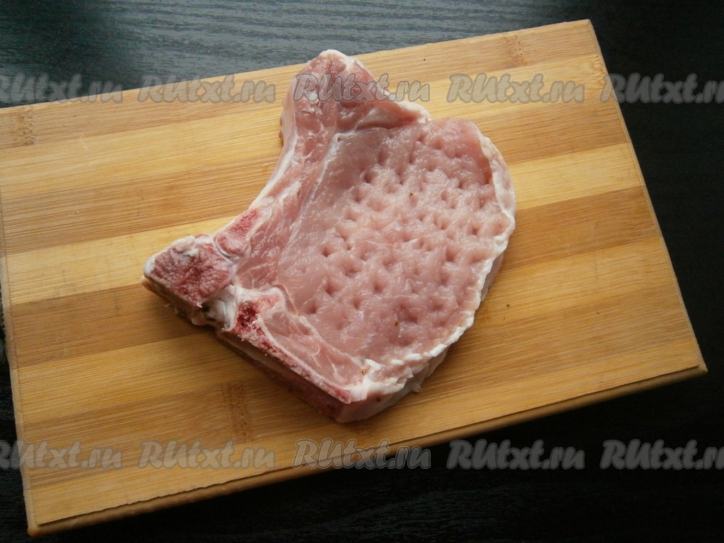 Свиной стейк на кости обмыть, обсушить, отбить слегка молоточком с двух сторон.