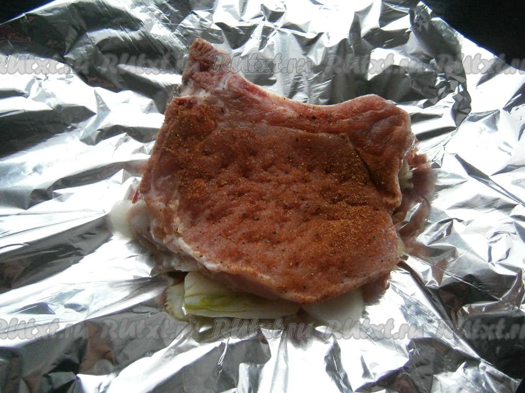 Стейк хорошенько натереть специями и поместить его на лук.