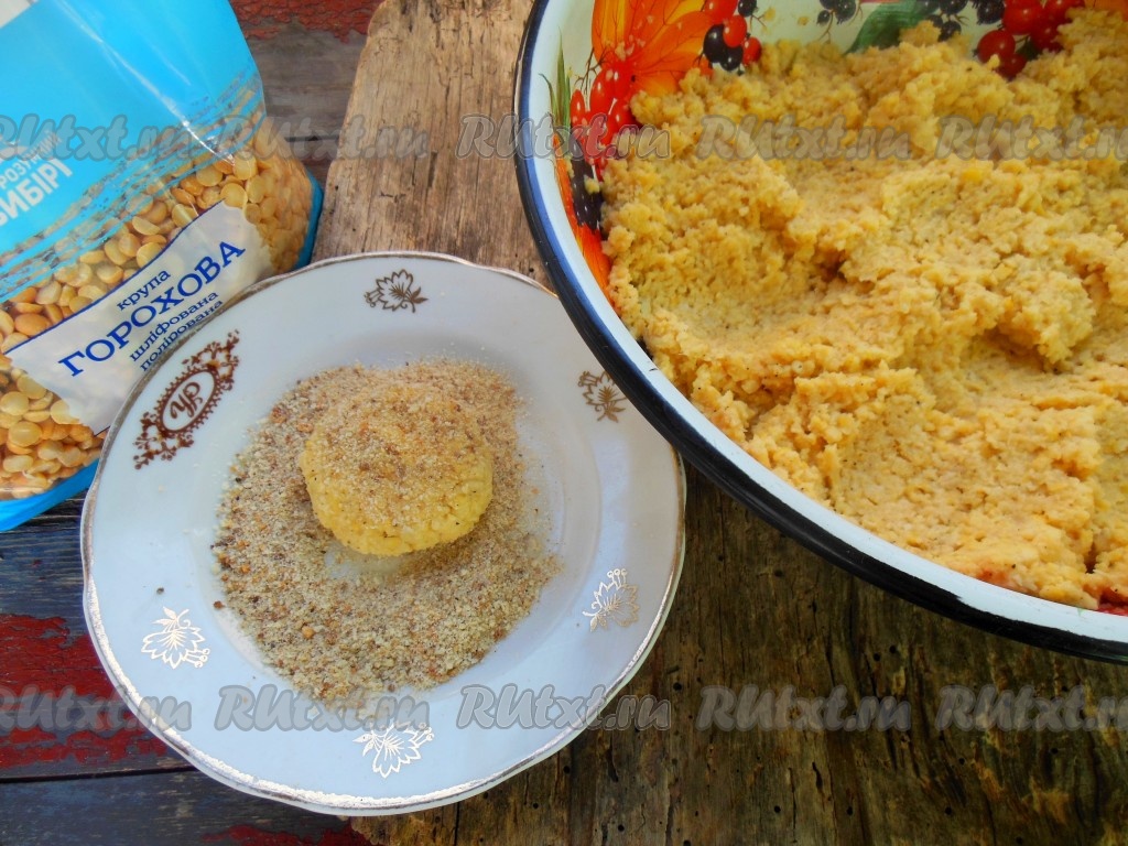 Сформируйте из горохового фарша котлету, обваляйте в панировочных сухарях. Кстати, даже без сухарей котлеты не распадаются. Поэтому можно жарить котлетки и без панировки.