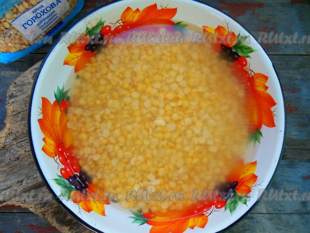 Горох хорошо промойте, залейте холодной водой и оставьте на 4-6 часов для набухания.