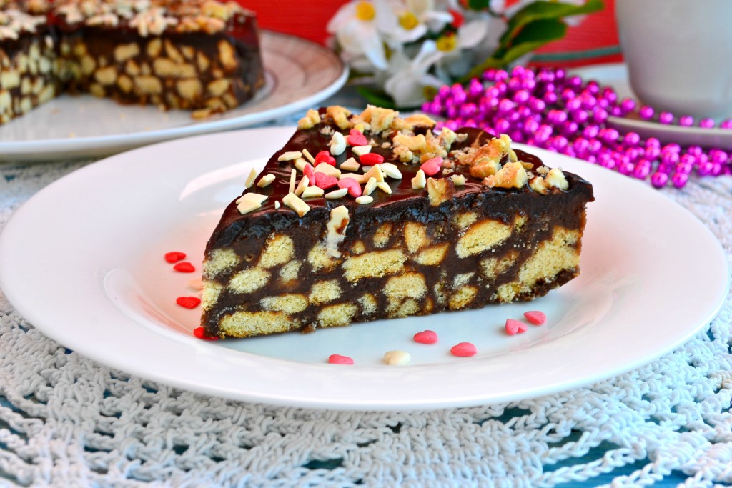Я еще добавила для украшения цветную посыпку в виде сердечек. Очень вкусный шоколадный торт из печенья, приготовленный без выпечки, разрежьте на части и подайте к столу. Разрез у тортика очень красивый!