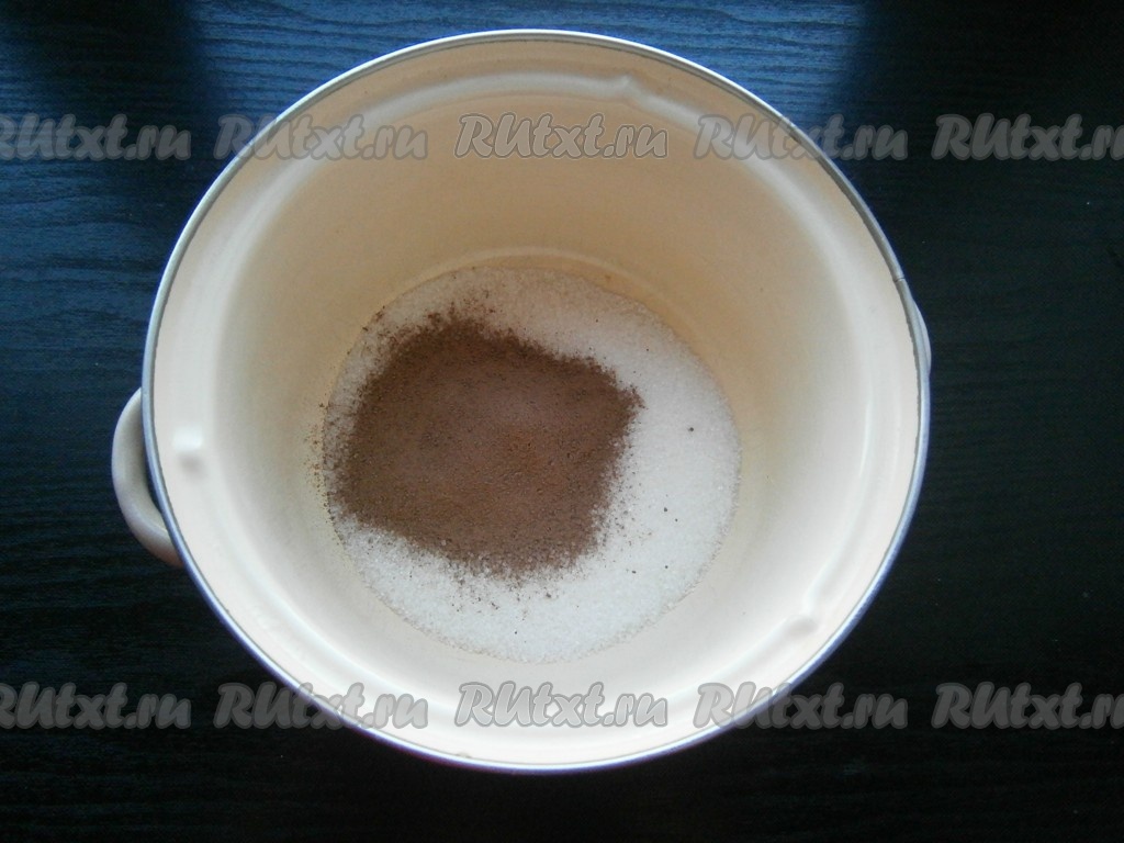 В кастрюлю всыпать 100 грамм сахара, добавить 30 грамм просеянного какао-порошка, перемешать.