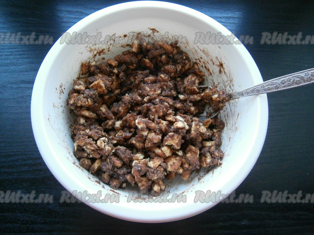 Дать смеси немного остыть, а затем вылить ее в печенье. Тщательно печенье перемешать ложкой.