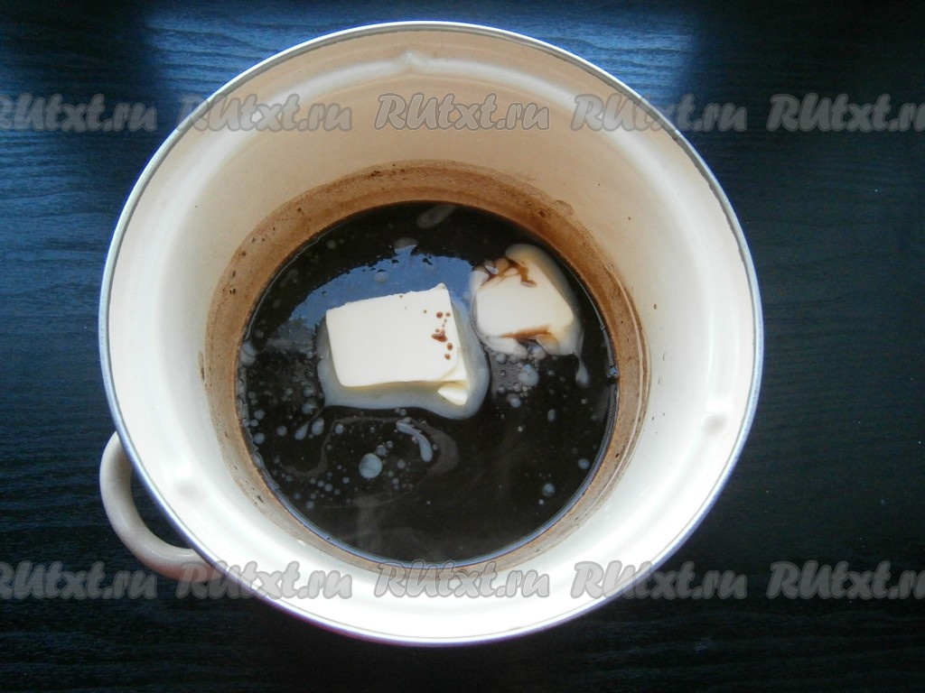 Поместить миску на небольшой огонь и при постоянном помешивании довести смесь до кипения. Варить минуты 3-4, чтобы глазурь стала однородной, затем добавить сливочное масло.