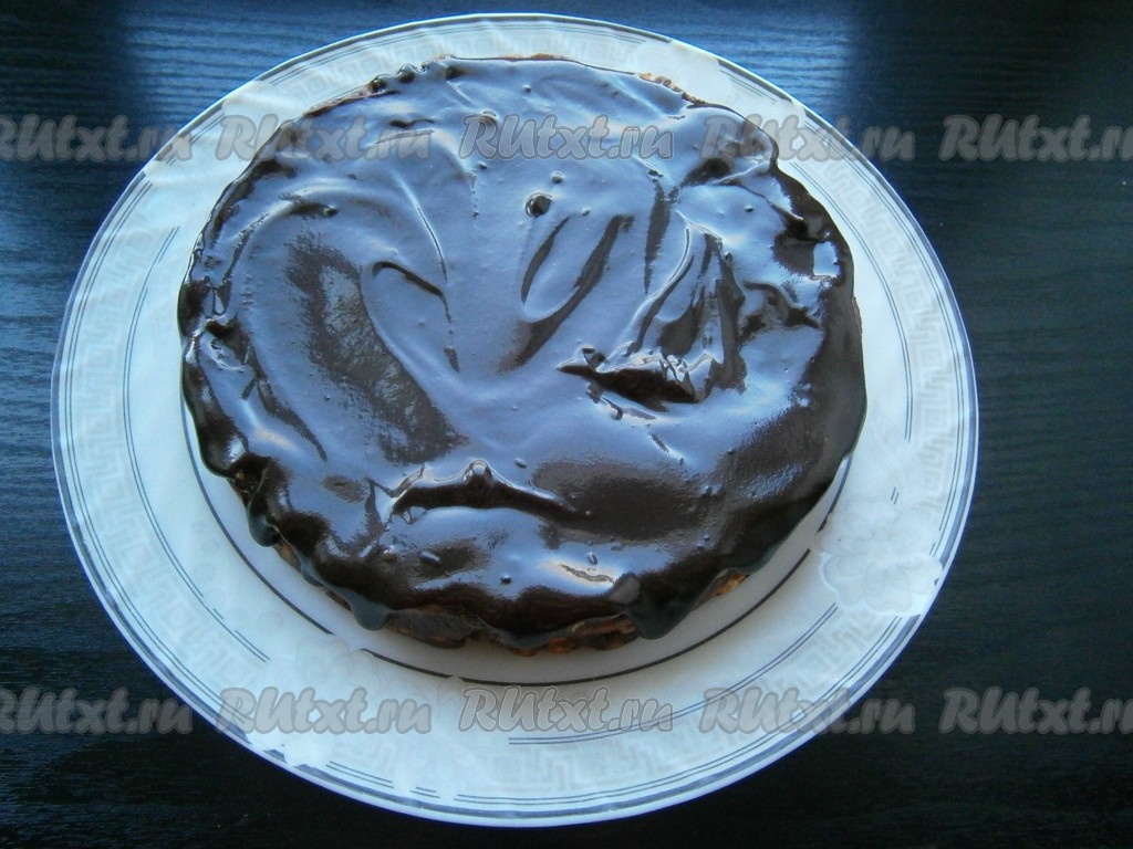 Дать глазури остыть до теплого состояния. Тортик вынуть из формы, убрать пленку и покрыть его сверху глазурью, размазав ее по всей поверхности.