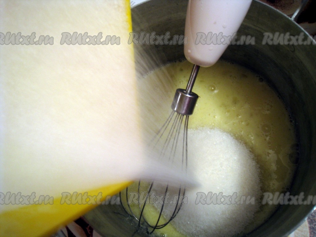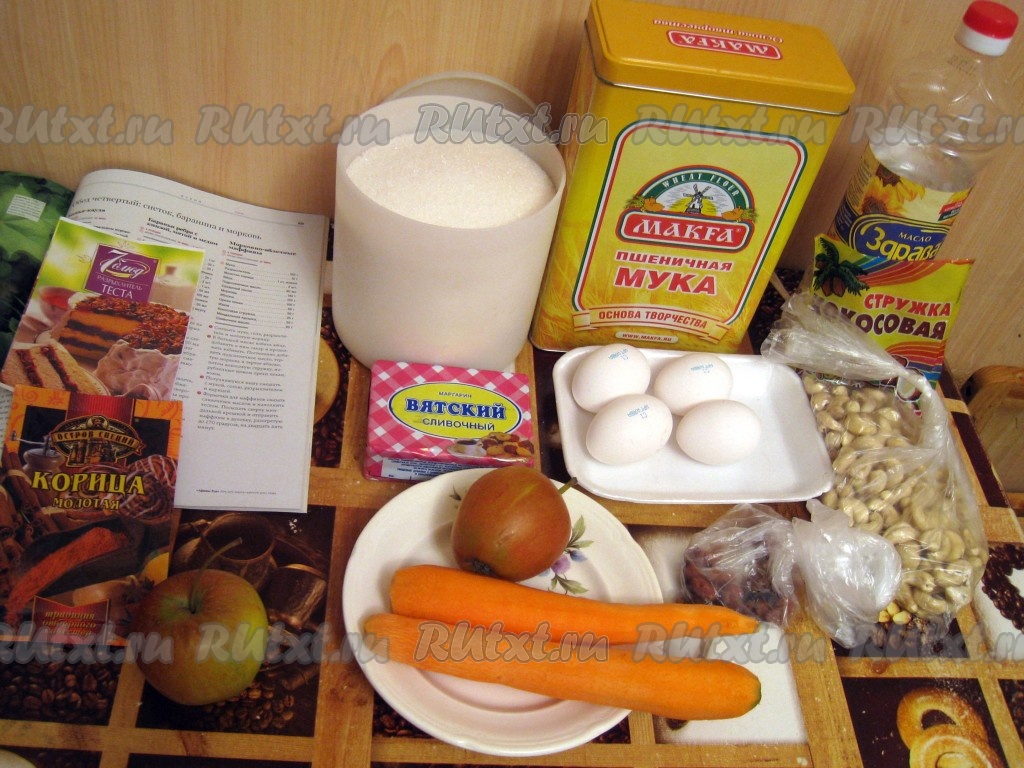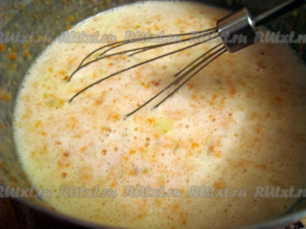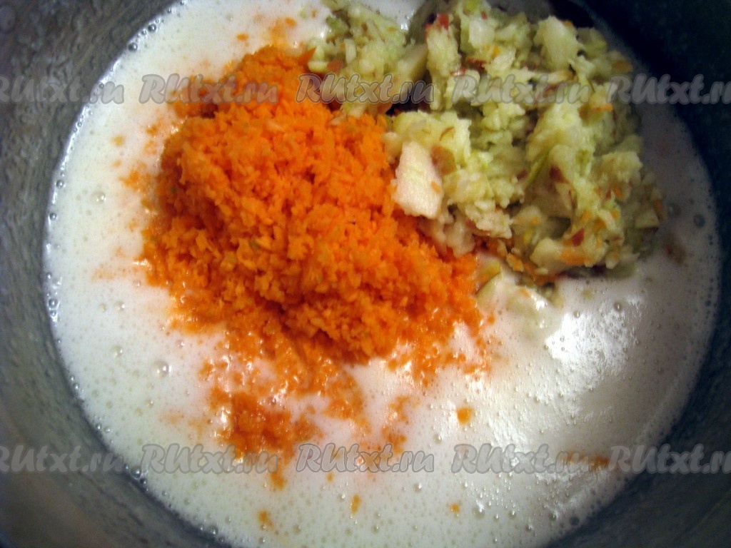Измельчить в блендере или натереть яблоки и морковь, добавить их к яйцам, сахару и растительному маслу.