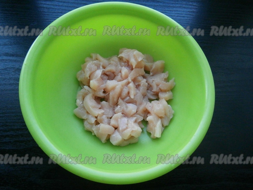 Куриное филе нарезать небольшими кусочками.