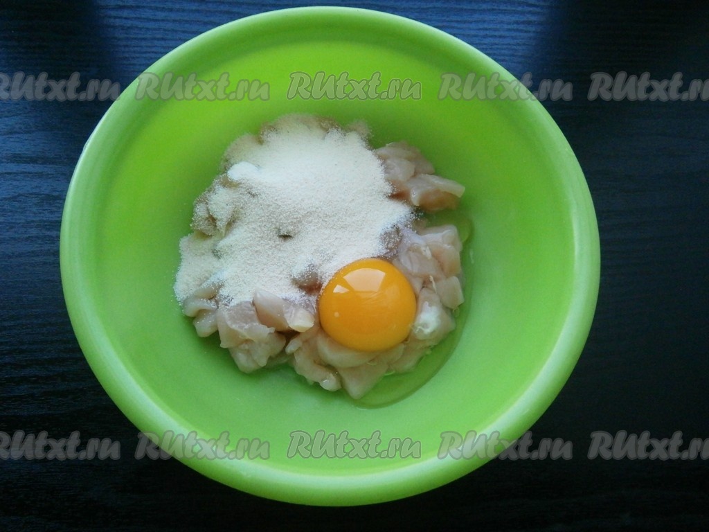 Манную крупу и сырое яйцо добавить к нарезанному куриному филе.