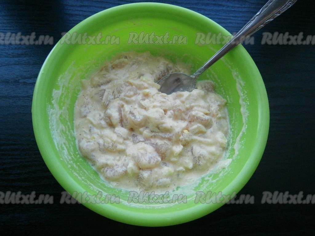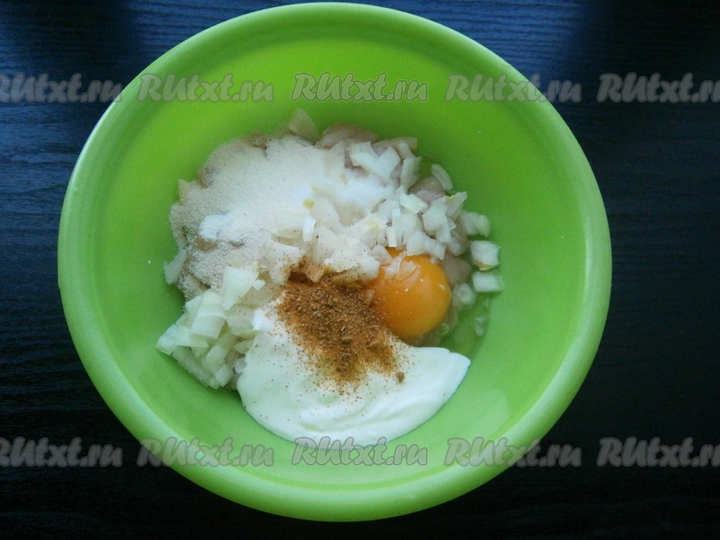 Сюда же добавить сметану, соль, специи, очищенный и мелко нарезанный репчатый лук.
