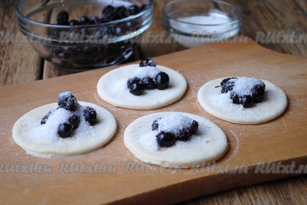 На каждый кружочек положить немного ягод, посыпать сахаром.