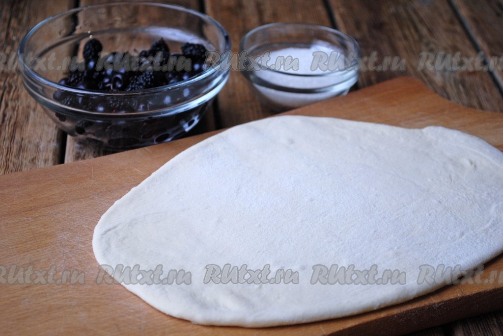 Затем отрезать кусок теста, остаток прикрыть полотенцем, чтобы не заветривалось. На присыпанном мукой столе раскатать отрезанное тесто в пласт толщиной около 5 мм. Тоньше раскатывать не нужно, так как начинка сочная и будет вытекать.