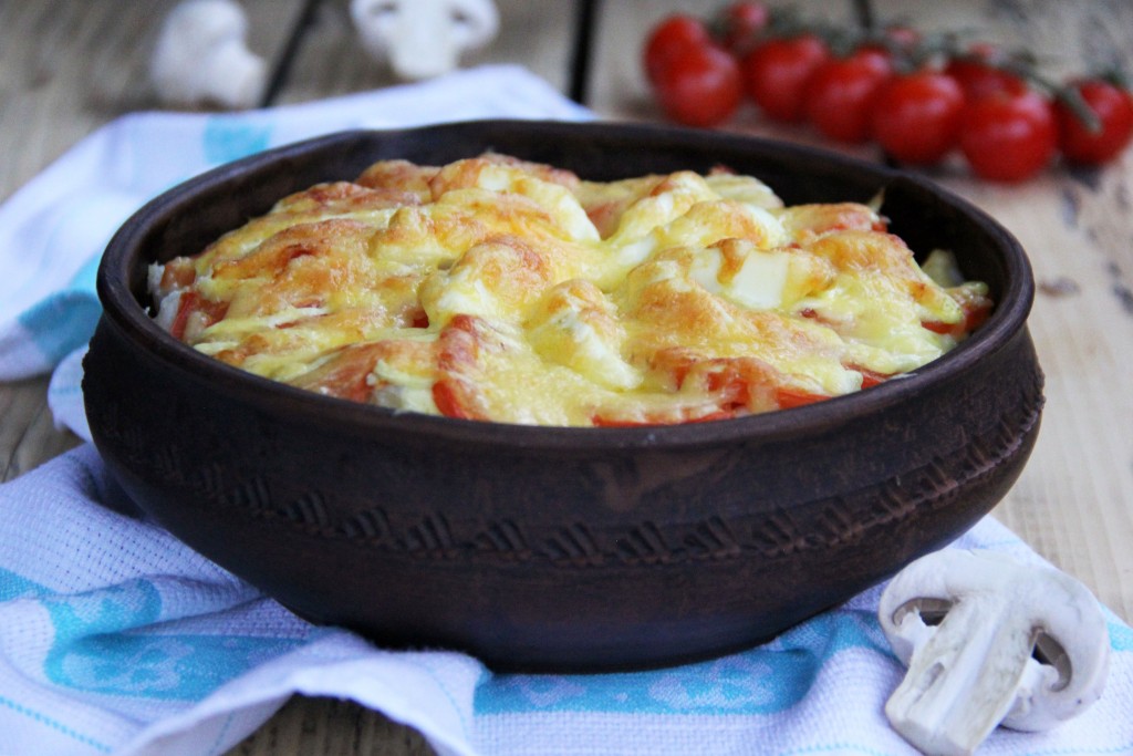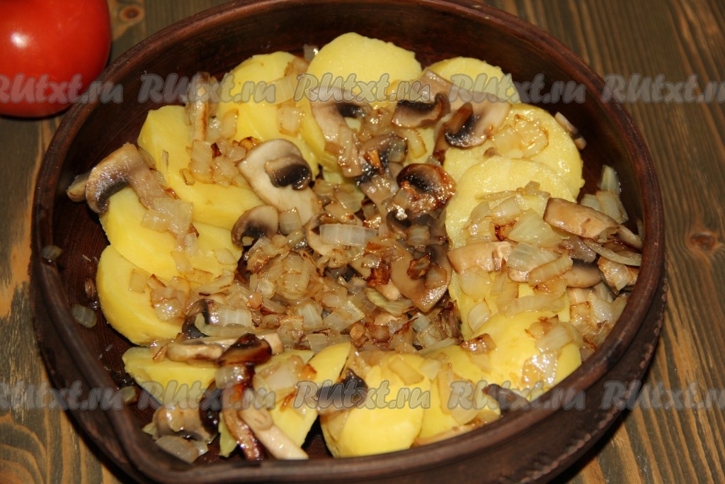 Поверх картофеля выложить грибы с луком, слегка посолить.