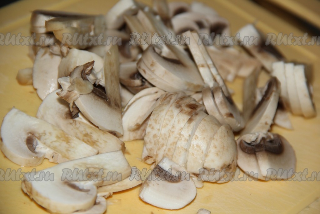Шампиньоны вымыть и нарезать пластинками.