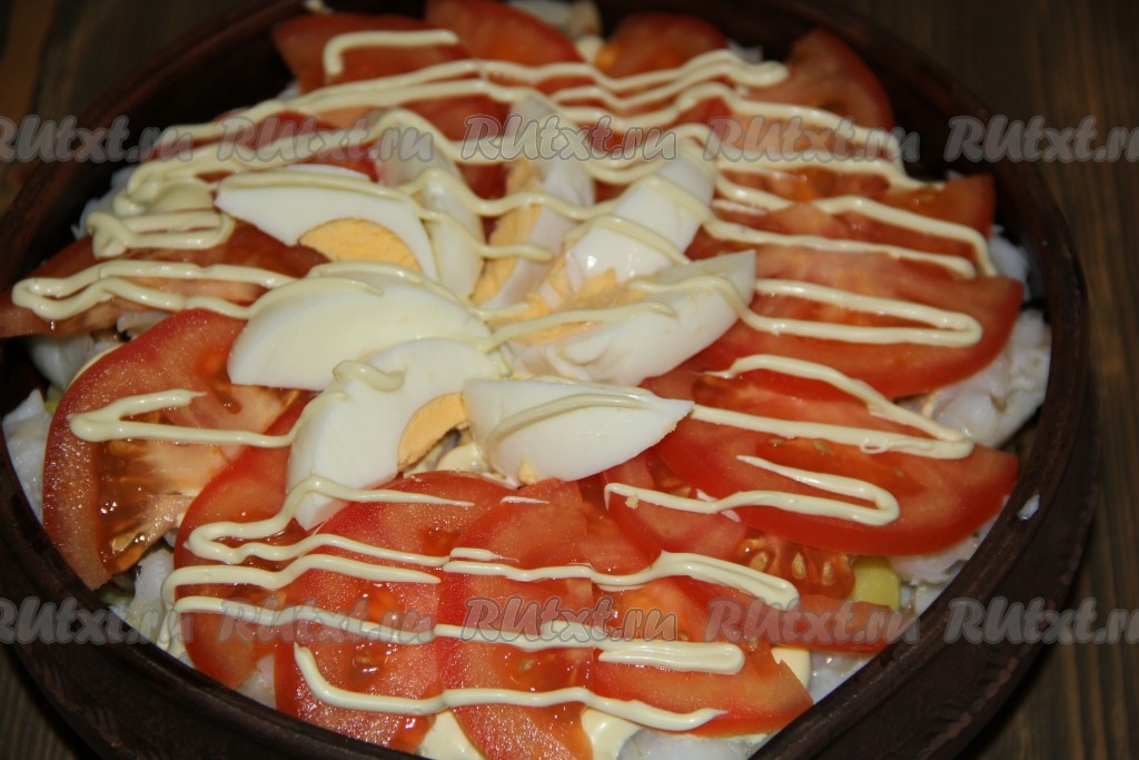 Поверх рыбы выложить кружочки (или ломтики) помидора. В середину выложить дольки яйца. Сделать сеточку из майонеза.