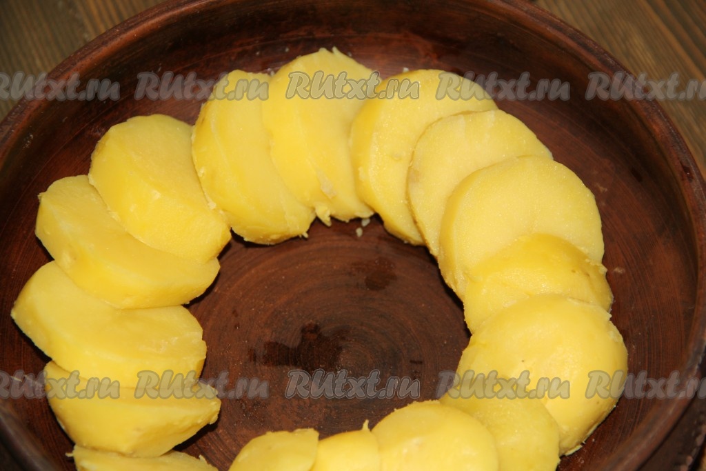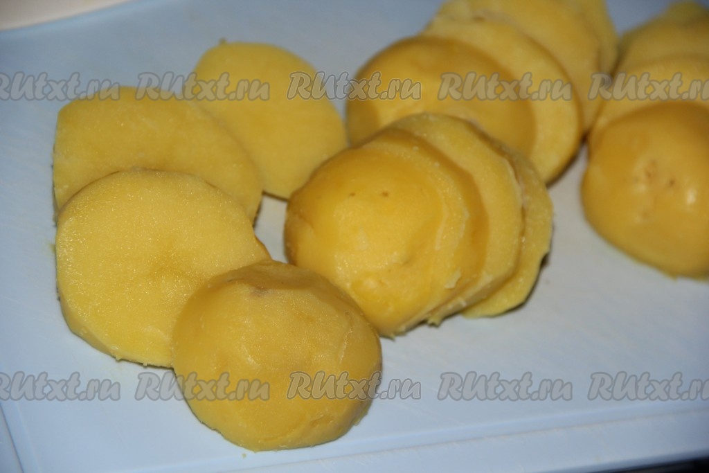 Вареный картофель очистить от кожуры и нарезать кружочками толщиной, примерно, 1 см.