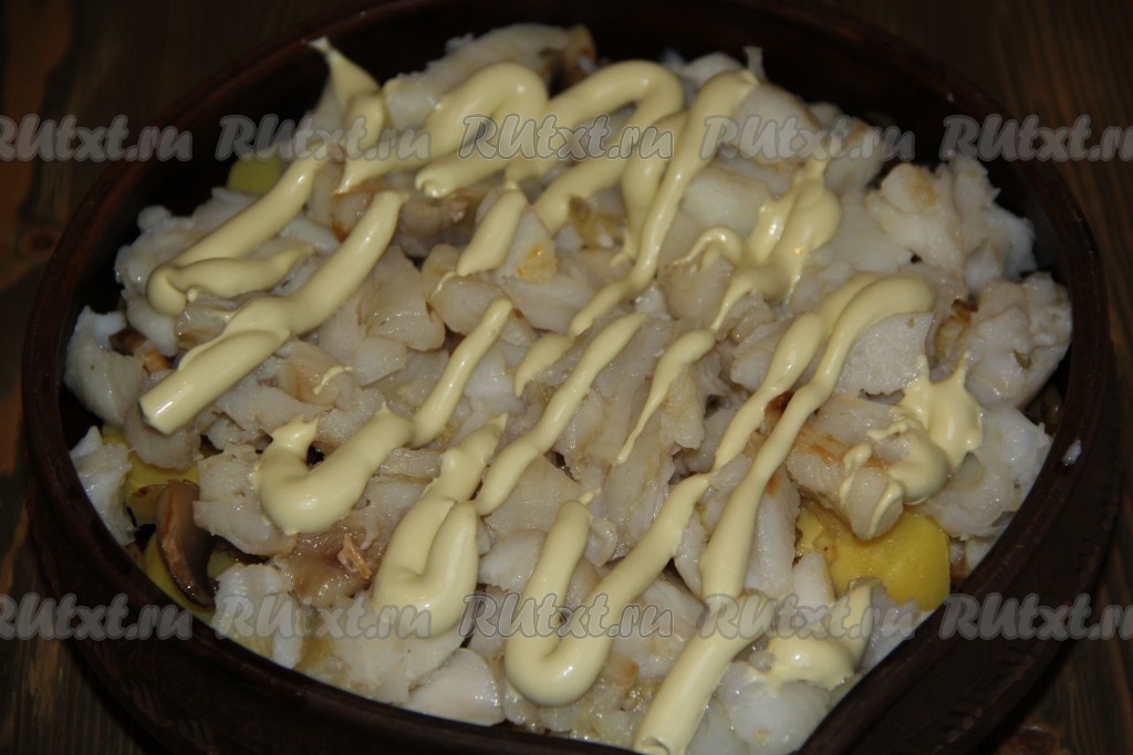 Рыбку посолить и обжарить на сильном огне с двух сторон на сковороде с добавлением растительного масла (примерно, по 2 минутки с каждой стороны). Затем выложить рыбу поверх грибов и нанести сеточку из майонеза.