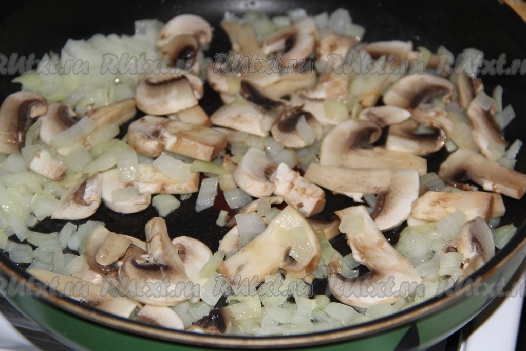 Добавить грибы в сковороду и обжарить вместе с луком в течение 10 минут на небольшом огне, помешивая.