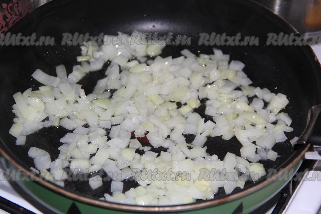Лук очистить и мелко нарезать. Обжарить лук, помешивая, до золотистого цвета на сковороде, разогретой с добавлением растительного масла.