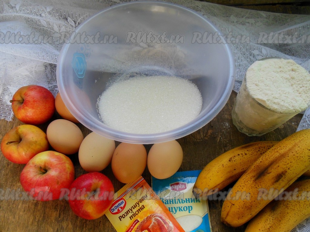 Вот такие ингредиенты понадобятся для приготовления шарлотки с яблоками и бананами.