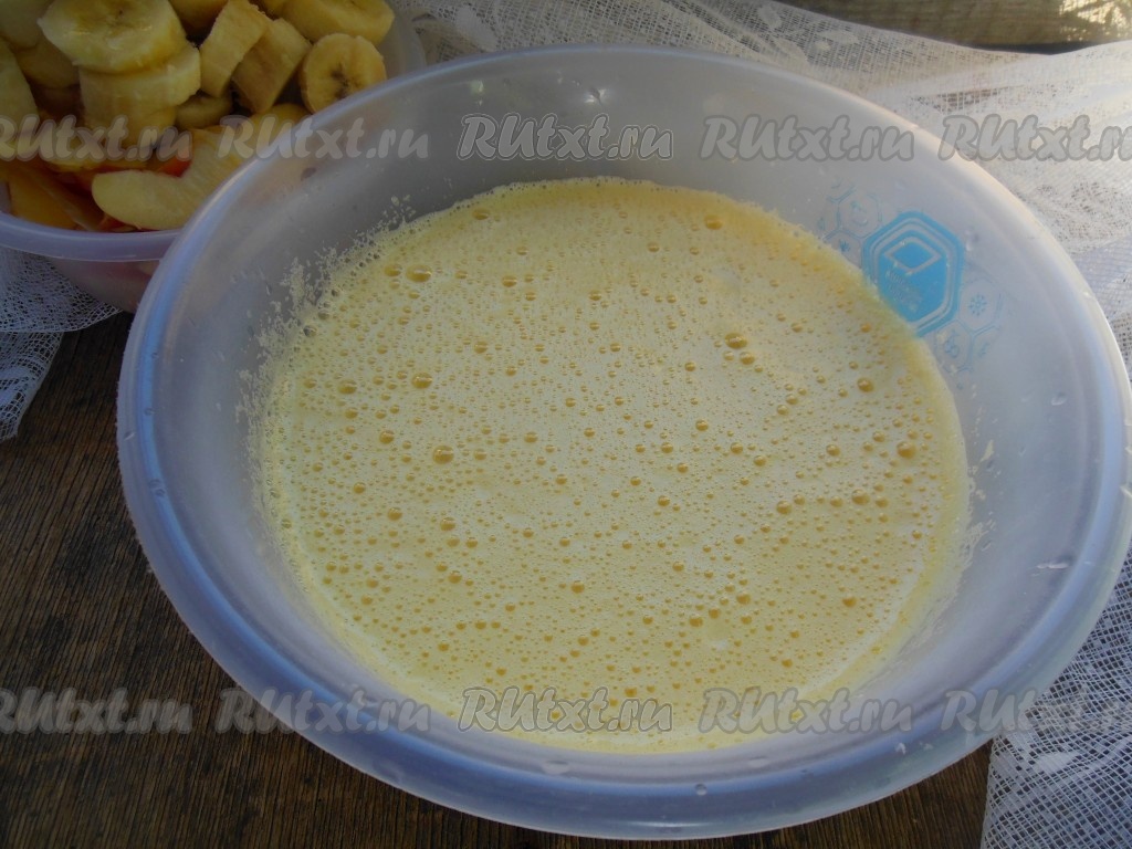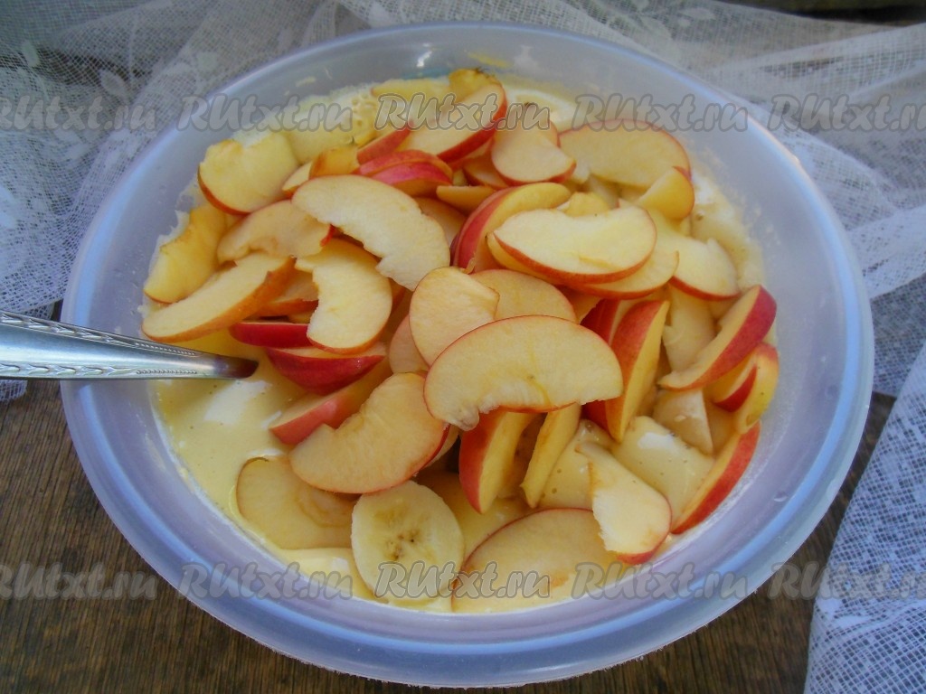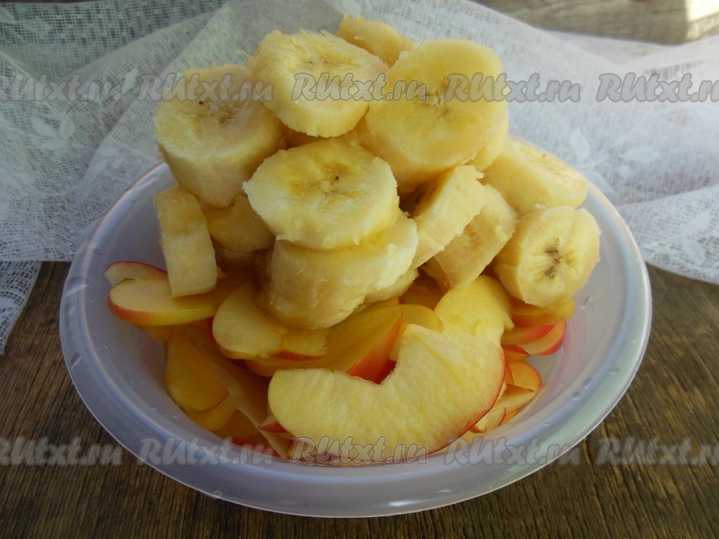 Яблоки нарежьте тонкими дольками, бананы очистите от кожуры и нарежьте колечками. Для того чтобы бананы и яблоки при выпечке не потемнели, полейте их лимонным соком.