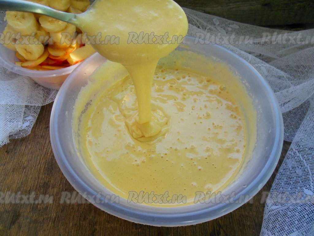 Перемешайте тесто при помощи ложки или взбейте на низких оборотах миксера. Готовое тесто легко стекает с ложки (как на фото) и напоминает сметану средней густоты.