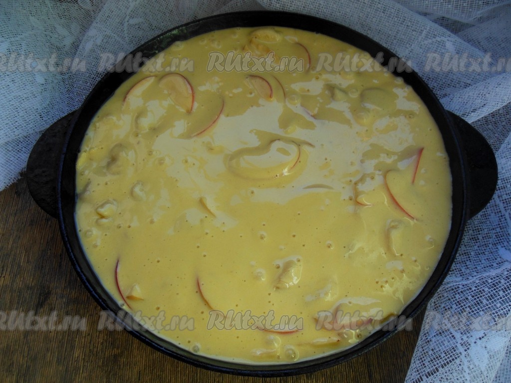 Форму для выпечки смажьте сливочным маслом или застелите пергаментной бумагой. Для выпечки я использую чугунную сковороду диаметром 26 см, она - толстостенная, поэтому идеально подходит для выпечки. Вылейте тесто в форму, выпекайте яблочно-банановую шарлотку 30-35 минут в разогретой духовке при температуре 170-180 градусов.