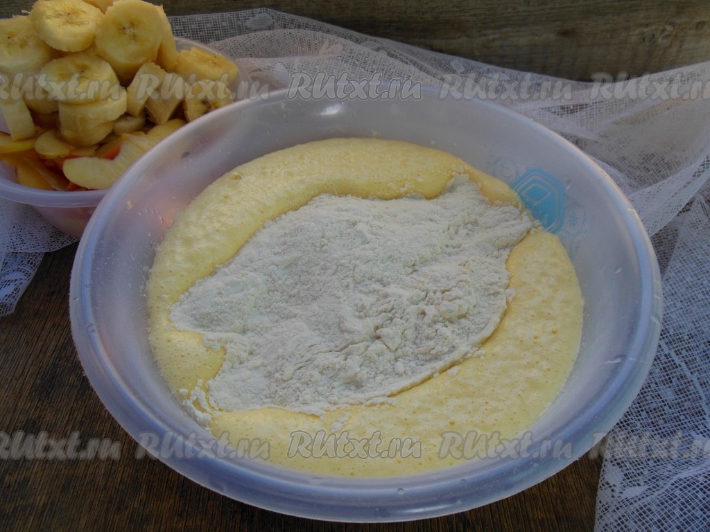 В тесто добавьте яблоки с бананами, перемешайте.