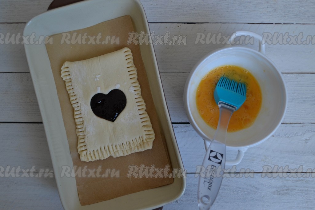 Аккуратно, используя силиконовую кисточку, смазать заготовку слойки яйцом. Сразу же присыпать тесто кунжутом.