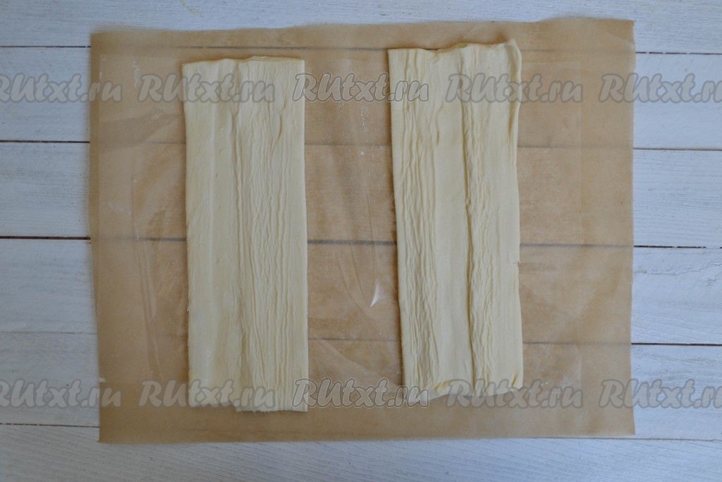 Замороженное слоеное тесто разморозить. И лучше это делать в холодильнике, оставив его там на ночь. Если нет времени ждать, можно разморозить покупное тесто в микроволновке на режиме "Разморозка". Аккуратно развернуть уже размороженное тесто на пергаменте и разрезать вдоль на полоски шириной, примерно, 8-10 см.